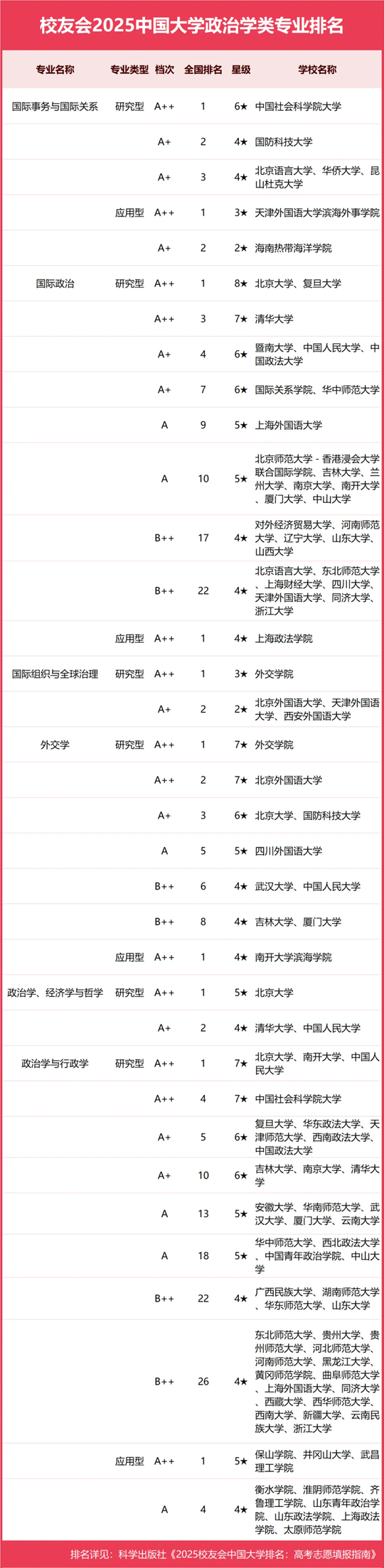 校友會2025中國大學政治學類專業排名(應用型)