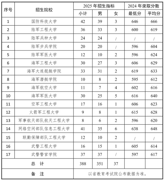 招生計劃:今年,國防科技大學、陸軍工程大學、陸軍兵種大學等17所軍隊院校在我省招生388人,其中男生351人、女生37人。具體專業(yè)招生計劃、選考科目及體格檢查標準等,在6月份省教育考試院編印的《2025年普通高校招生計劃》中統(tǒng)一公布。