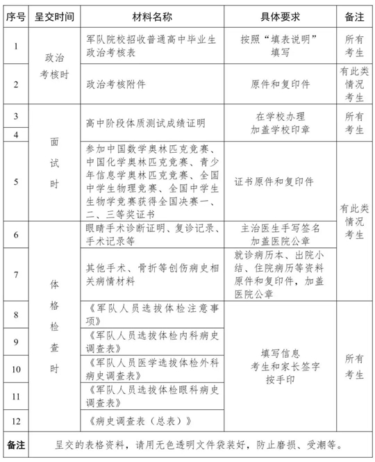 一、政治考核時間地點。7月1日,所在高中通知上線考生攜帶個人身份證、準考證、戶口本、一寸準考證免冠照片,7月2日自行前往戶籍所在地的縣(市、區(qū))人武部(省外戶籍考生到高考報名所在地人武部),報名參加政治考核,逾期視為無意愿報考。