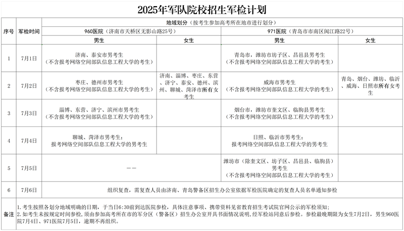 山東省2025年軍隊院校招生軍檢計劃