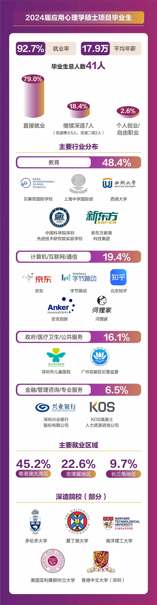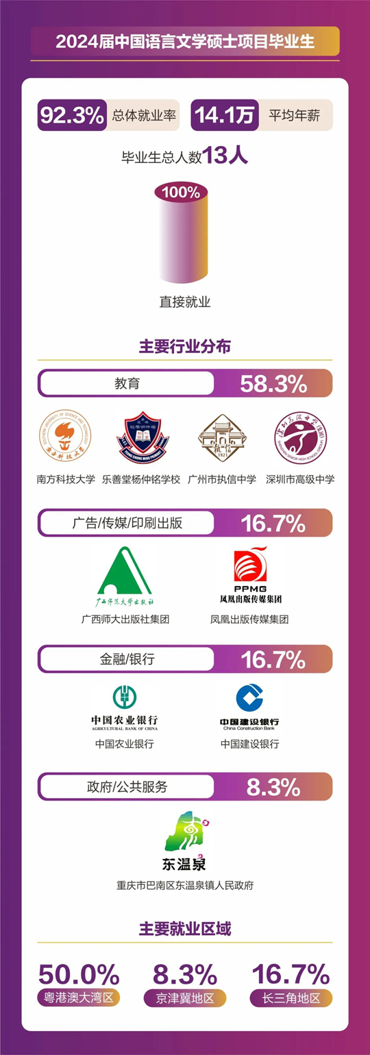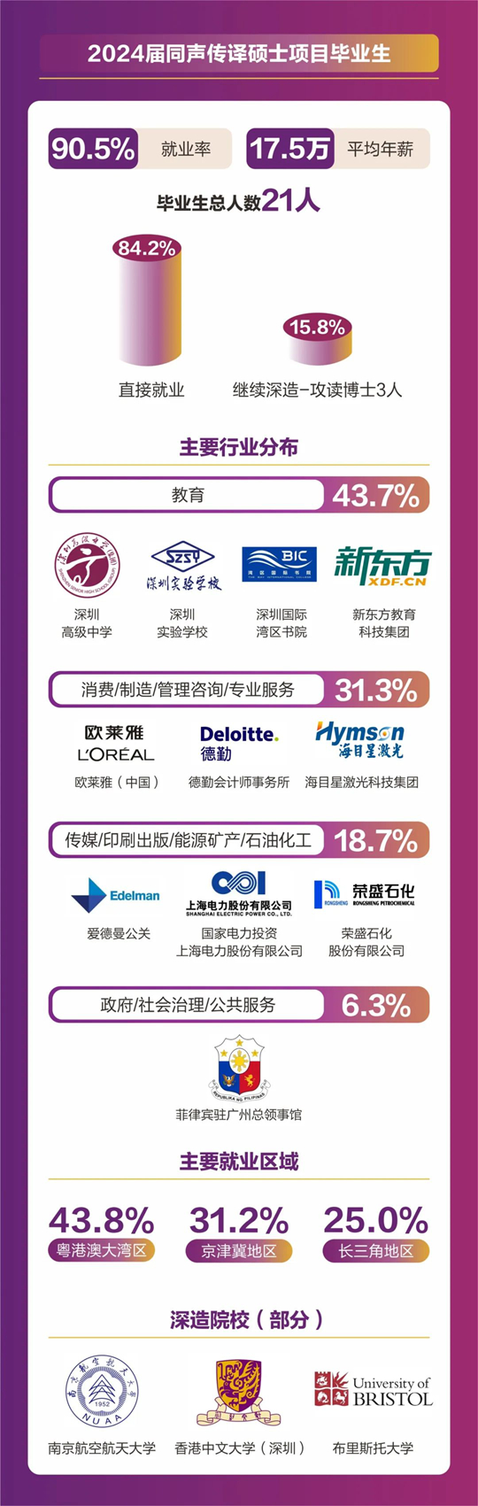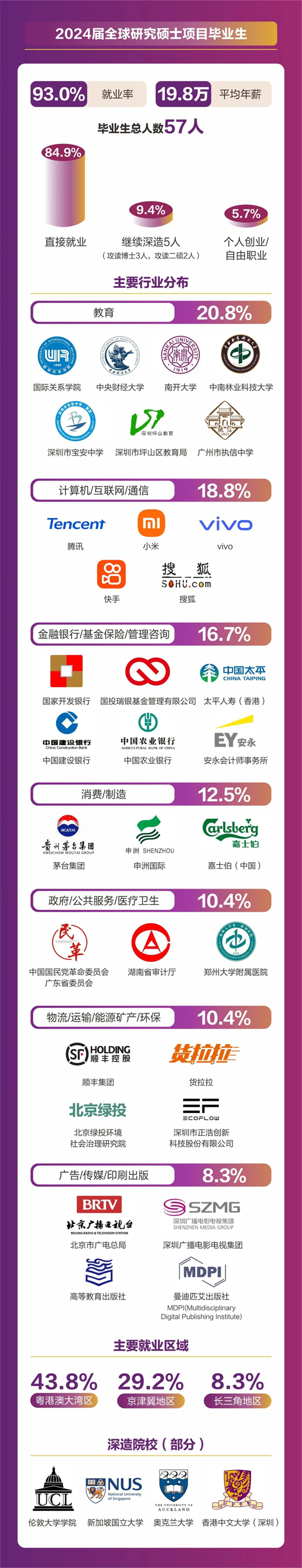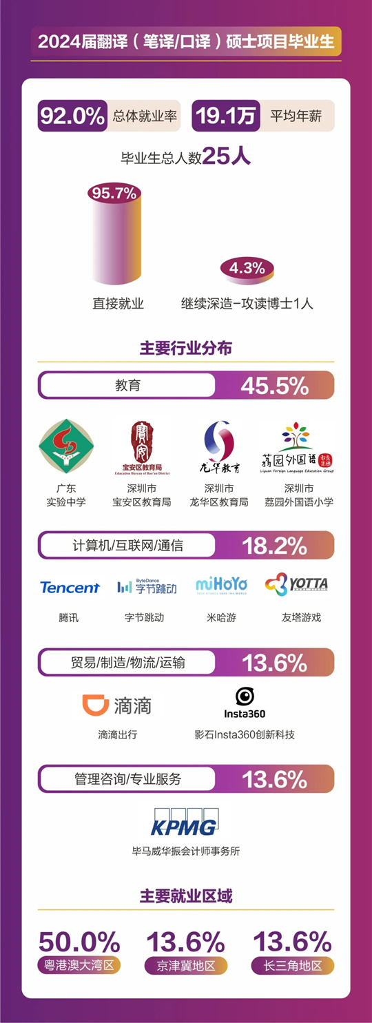 人文社科學院碩士畢業(yè)人數(shù)共計157人,分別來自翻譯(筆譯/口譯)、同聲傳譯、應用心理學、全球研究、中國語言文學等5個碩士項目。2024屆碩士畢業(yè)生總體就業(yè)率達到92.36%,平均年薪為18. 4萬元。其中86.2%畢業(yè)生選擇直接就業(yè),畢業(yè)生就業(yè)行業(yè)分布廣泛,涵蓋了教育、計算機/互聯(lián)網(wǎng)/通信、貿(mào)易/消費/制造/營運、金融/銀行/證券/基金、政府/社會治理/公共服務(wù)、廣告/傳媒/印刷出版、管理咨詢/專業(yè)服務(wù)、能源礦產(chǎn)/石油化工/環(huán)保、醫(yī)藥生物/醫(yī)療衛(wèi)生、物流/運輸?shù)榷鄠行業(yè)領(lǐng)域。就業(yè)地點主要集中在粵港澳大灣區(qū)、京津冀區(qū)以及長三角地區(qū)等一線城市及生活圈。11%的學生則選擇繼續(xù)深造,其中12人將在境內(nèi)外知名院校攻讀博士學位。