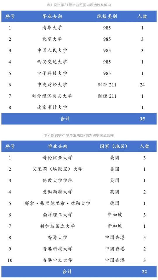 四度春秋磨礪,收獲累累碩果。中央財經大學投資學專業2021級畢業班同學們銳意進取、奮力拼搏,學習于課堂之上,鍛煉于實踐之間,積極擁抱數字創新、交叉融合的時代浪潮,踴躍踐行經世濟民、財菁強國的青年使命,以優異的成績與全面的成長,交出又一份畢業季亮眼答卷。截止目前,已有35位同學確定國內升學深造,22位同學確定國/境外留學深造,畢業深造率為73.08%。國內深造高校涵蓋了包括清華大學、北京大學、中國人民大學、西安交通大學、電子科技大學、中央財經大學、對外經濟貿易大學在內的國內知名高校(見表1);國/境外留學高校涵蓋了包括哥倫比亞大學、曼徹斯特大學、新加坡國立大學、南洋理工大學等在內的國際知名高校(見表2)。