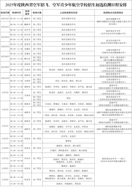 | 2025年度陜西省空軍招飛及青少年航空學校招生初選檢測安排 |