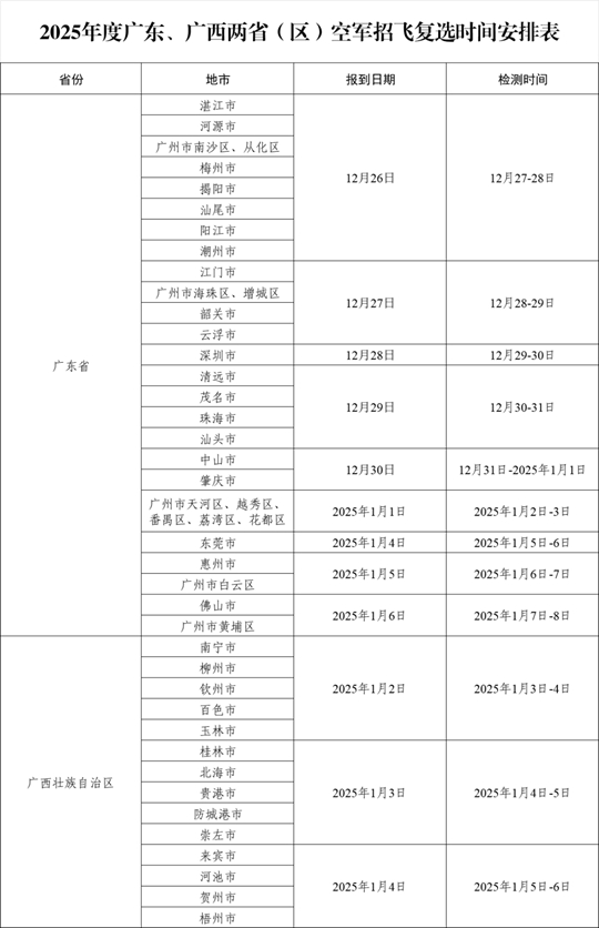 根據空軍招飛年度工作安排,將于12月26日至2025年1月8日,在廣州選拔中心(廣州)設站,組織粵、桂兩。▍^)空軍招收高中生飛行學員復選檢測工作,現將有關事項通知如下: