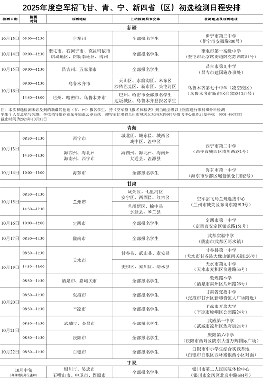 根據(jù)年度空軍招飛工作安排,我部將于2024年10月13日至10月22日開展甘、青、寧、新四省(區(qū))2025年度空軍招飛初選檢測(cè)工作。具體日程安排如下:
