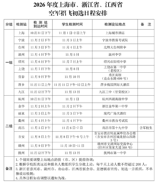 根據(jù)2026年度空軍招飛工作安排,11月1日至11月13日,空軍招飛局南京選拔中心將派初選組赴上海市、浙江省、江西省等地,對(duì)報(bào)考空軍飛行學(xué)員的學(xué)生進(jìn)行檢測(cè)。