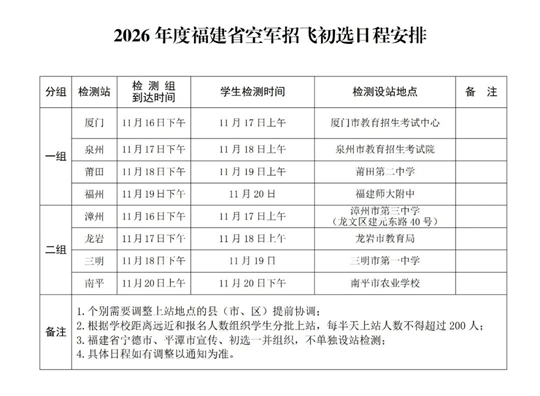 根據2026年度空軍招飛工作安排,11月17日至11月20日,空軍招飛局南京選拔中心將派初選組赴福建省各地市對報考空軍飛行學員的學生進行檢測。