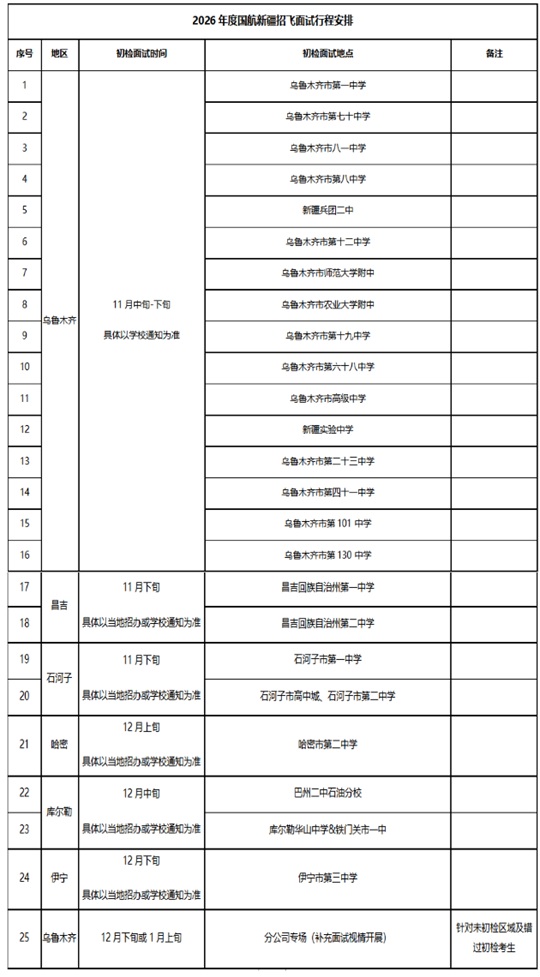 溫馨提示:初檢面試即將于2025年11月中旬陸續(xù)開(kāi)展,以上安排為計(jì)劃,如有變動(dòng),由國(guó)航新疆分公司招飛辦公室與各地招生辦、學(xué)校協(xié)商后另行通知。為提升初檢面試效率,每天的初檢面試活動(dòng)分為不同場(chǎng)次進(jìn)行,請(qǐng)考生按照學(xué)校或短信通知的時(shí)間提前10分鐘到場(chǎng)。