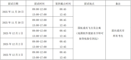 1.僅接受參加國(guó)航重慶地區(qū)線上初檢合格且在國(guó)航招飛管理平臺(tái)完成面試預(yù)約的考生參加面試,面試流程為:簽到(預(yù)約時(shí)間前15分鐘停止簽到)—身高體重復(fù)測(cè)—飛行職業(yè)能力傾向測(cè)試—英語(yǔ)能力測(cè)試—集中面試,每名考生考核及等候時(shí)間約為4小時(shí),請(qǐng)考生合理安排出行計(jì)劃。
