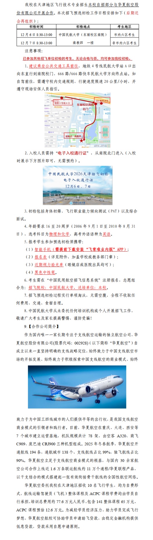 中國民航大學:天津地區2026年招飛預選初檢安排(本校自招部分)-招飛信息網