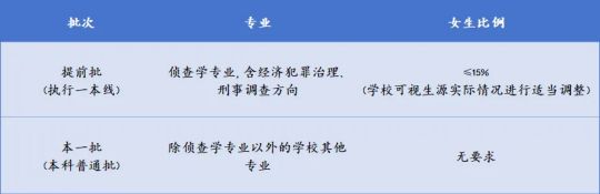 學校提前批次專業(yè)有女生比例限制要求,除偵查學專業(yè)以外的其他專業(yè)無女生比例限制。
