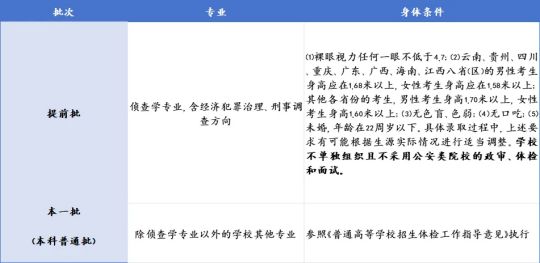 學校提前批次專業(yè)對考生身體條件有一定要求,除偵查學專業(yè)以外的其他專業(yè)對考生身體條件無特殊要求。有意報考偵查學專業(yè)的考生無需政審、體檢和面試,考生直接填報志愿即可。