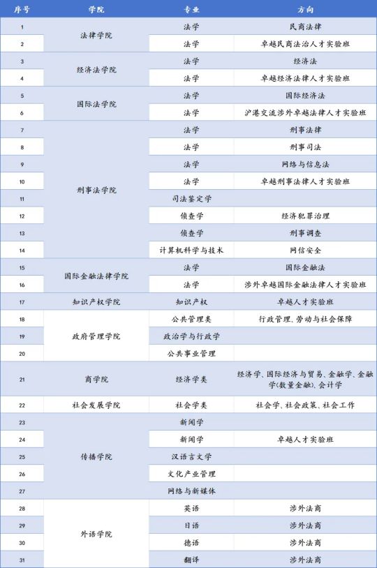 2024年學校本科招生專業(yè)共有24個,其中法學、政治學與行政學、行政管理、知識產權、新聞學、社會工作、翻譯、文化產業(yè)管理等專業(yè)入選國家級一流本科專業(yè)建設點,金融學、偵查學、會計學、公共事業(yè)管理等專業(yè)入選上海市一流本科專業(yè)建設點。