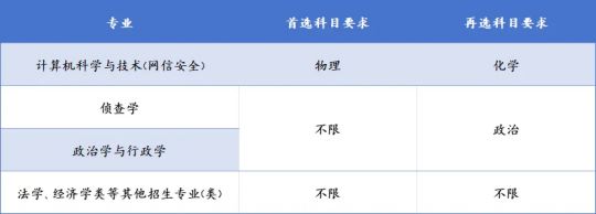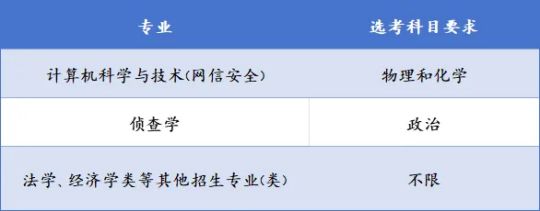 學校在上述5省(市)錄取批次主要為普通類提前錄取(偵查學專業(yè))和普通類平行錄取。本科提前錄取批次的偵查學專業(yè)選考科目為政治,普通錄取批次中計算機科學與技術(網信安全)選考科目為物理和化學。除上述2個專業(yè)以外,學校所有本科專業(yè)對考生的選考科目均為不限。