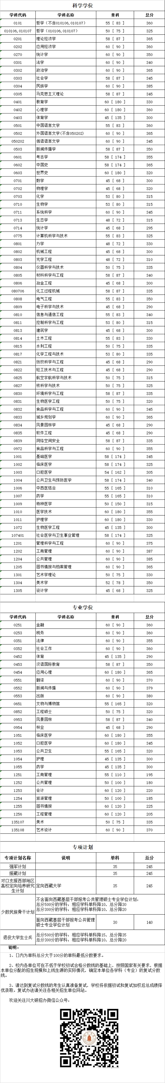 四川大學2019年碩士研究生入學考試初試合格分數線