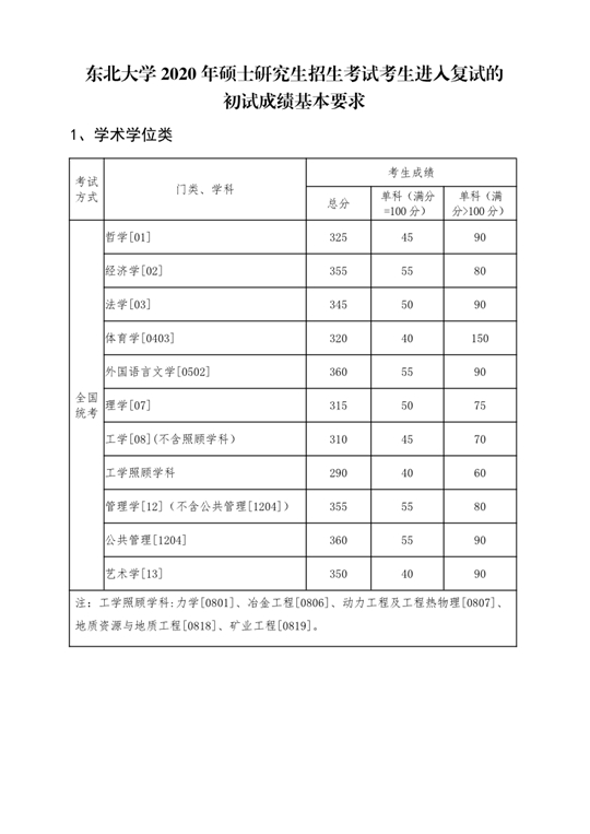 東北大學2020年碩士研究生招生考試考生進入復試的初試成績基本要求