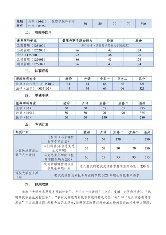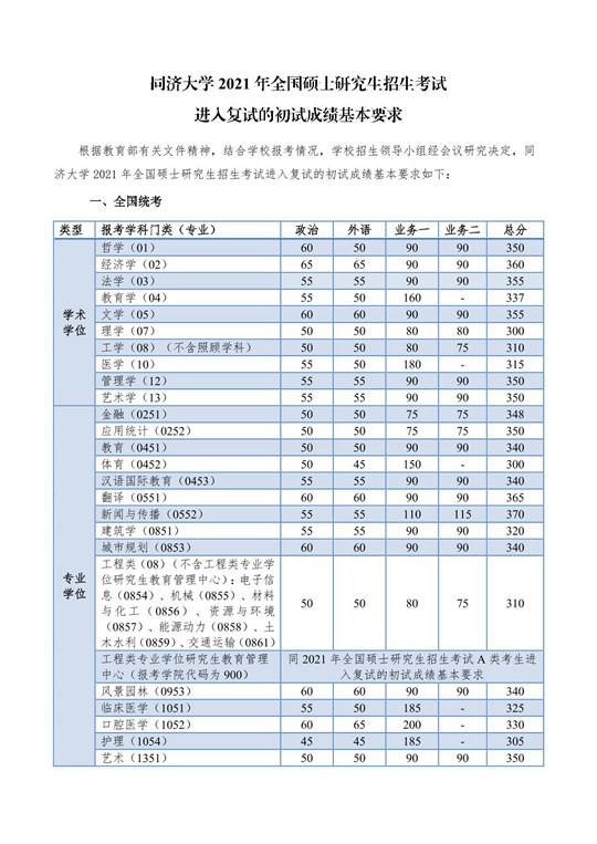 同濟大學2021年全國碩士研究生招生考試進入復試的初試成績基本要求