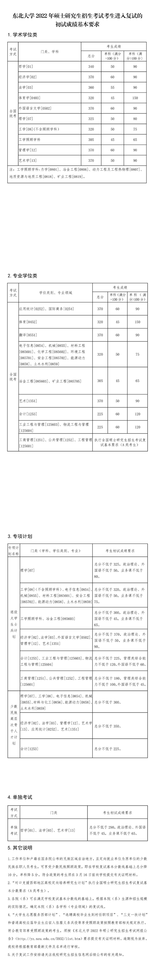 東北大學2022年碩士研究生招生考試考生進入復試的初試成績基本要求