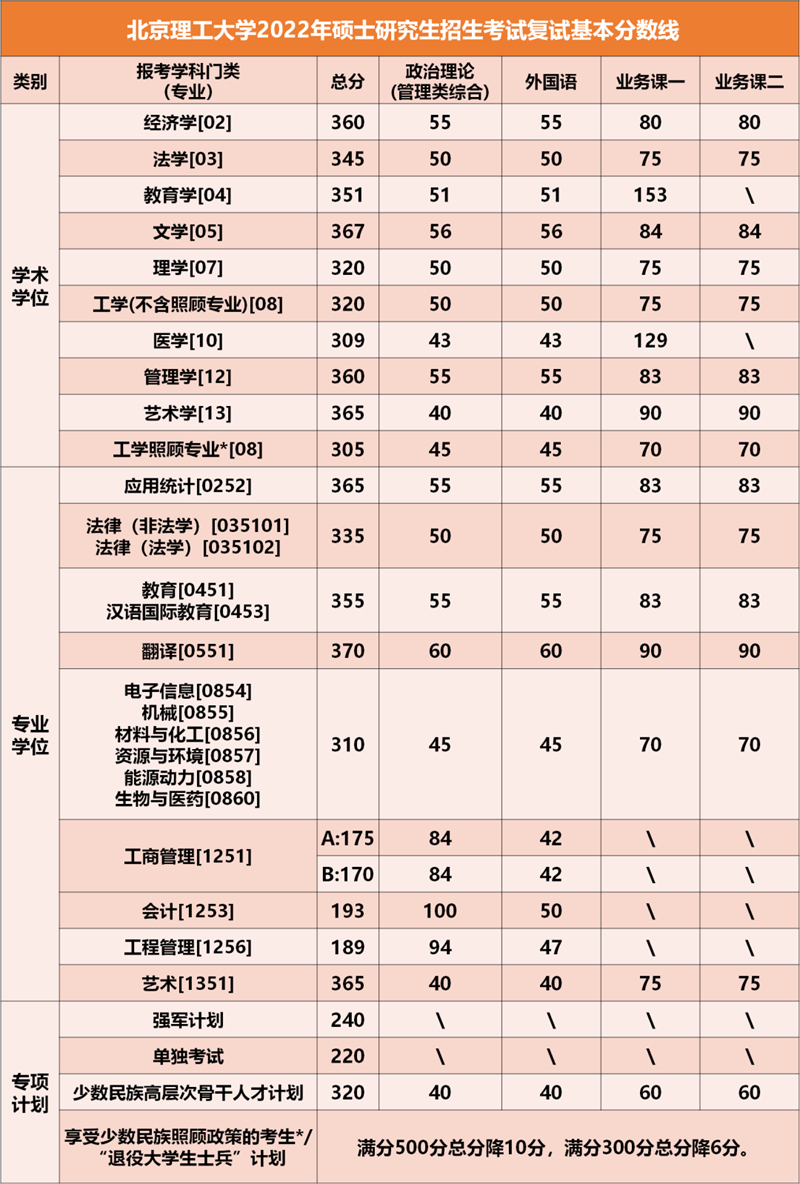 現(xiàn)將北理工2022年碩士研究生招生考試復(fù)試基本分數(shù)線公布如下: