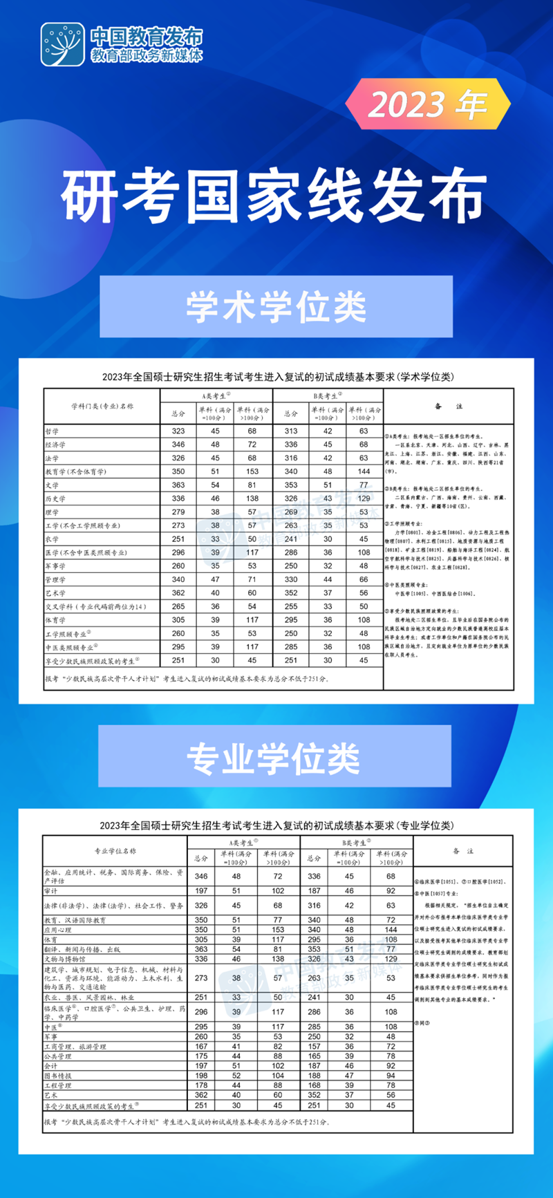 據(jù)“微言教育”最新消息:2023年全國碩士研究生招生考試考生進(jìn)入復(fù)試的初試成績基本要求公布,如圖。