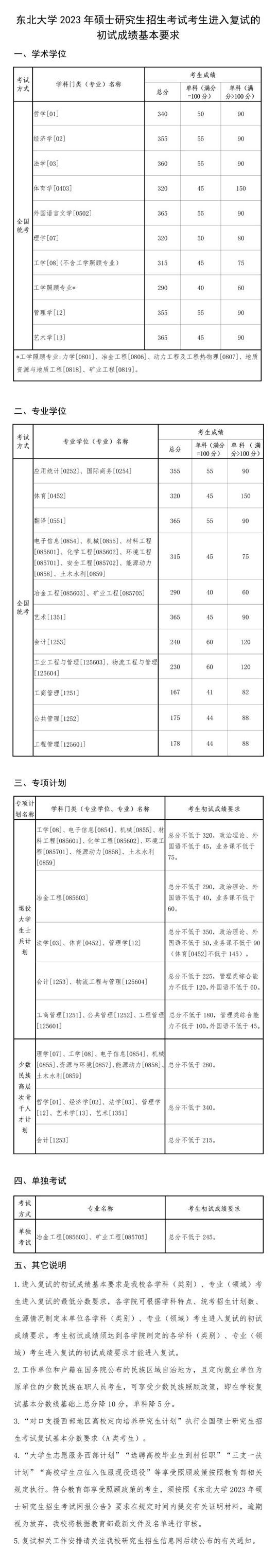 東北大學2023年碩士研究生招生考試考生進入復試的初試成績基本要求