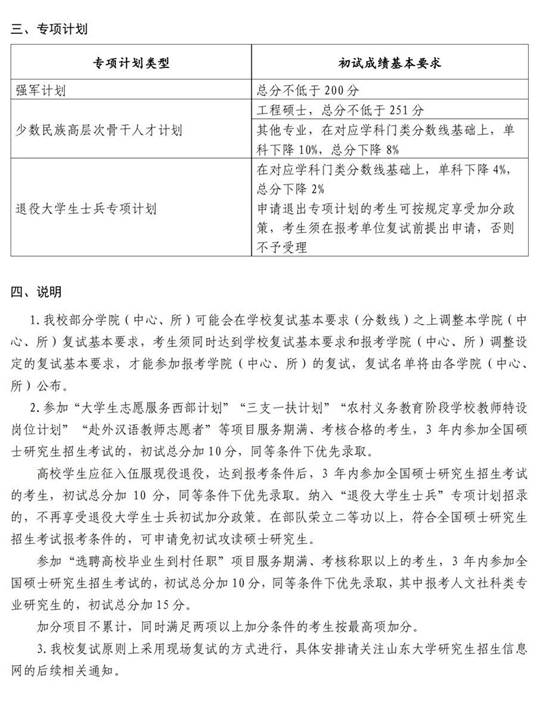山東大學2023年碩士研究生招生考試考生進入復試的初試成績基本要求