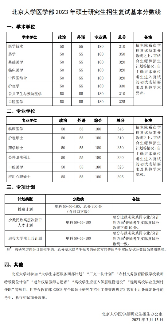 北京大學醫學部2023年碩士研究生招生復試基本分數線