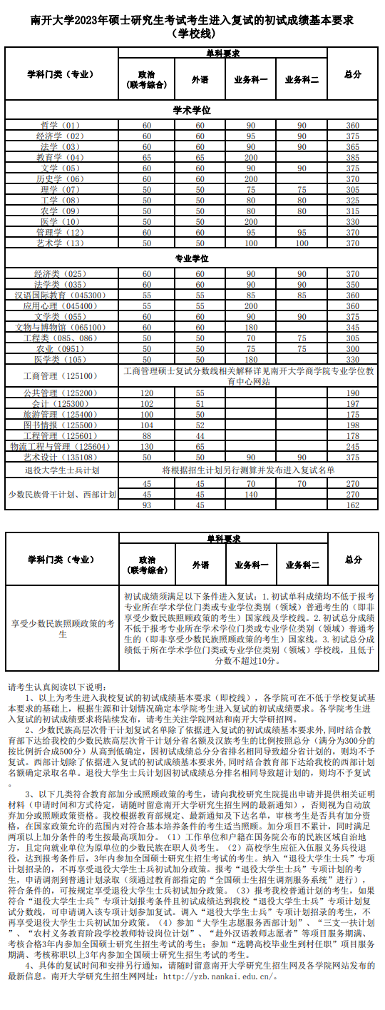 南開大學2023年碩士研究生考試考生進入復試的初試成績基本要求