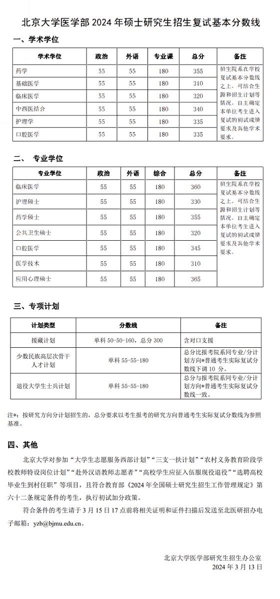 北京大學醫學部2024年碩士研究生招生復試基本分數線