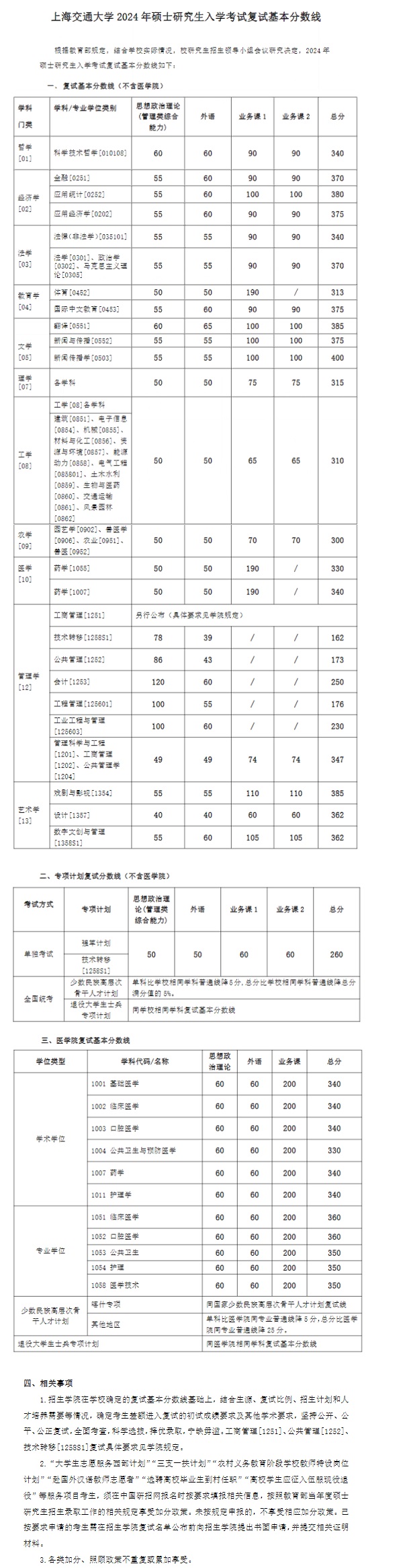 上海交通大學(xué)2024年碩士研究生入學(xué)考試復(fù)試基本分?jǐn)?shù)線