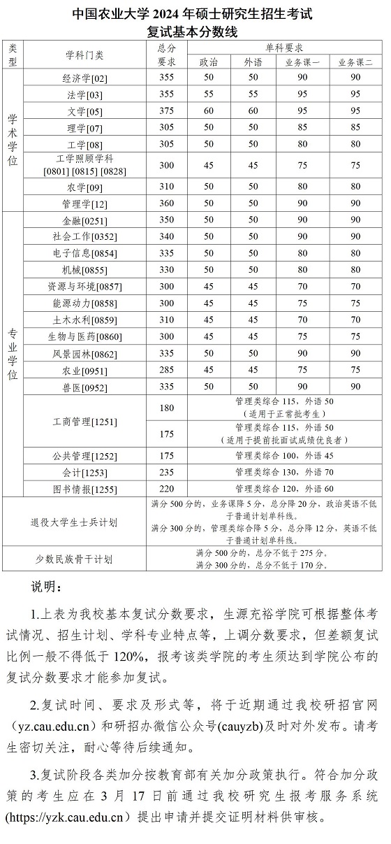 中國農業大學2024年碩士研究生招生考試復試基本分數線