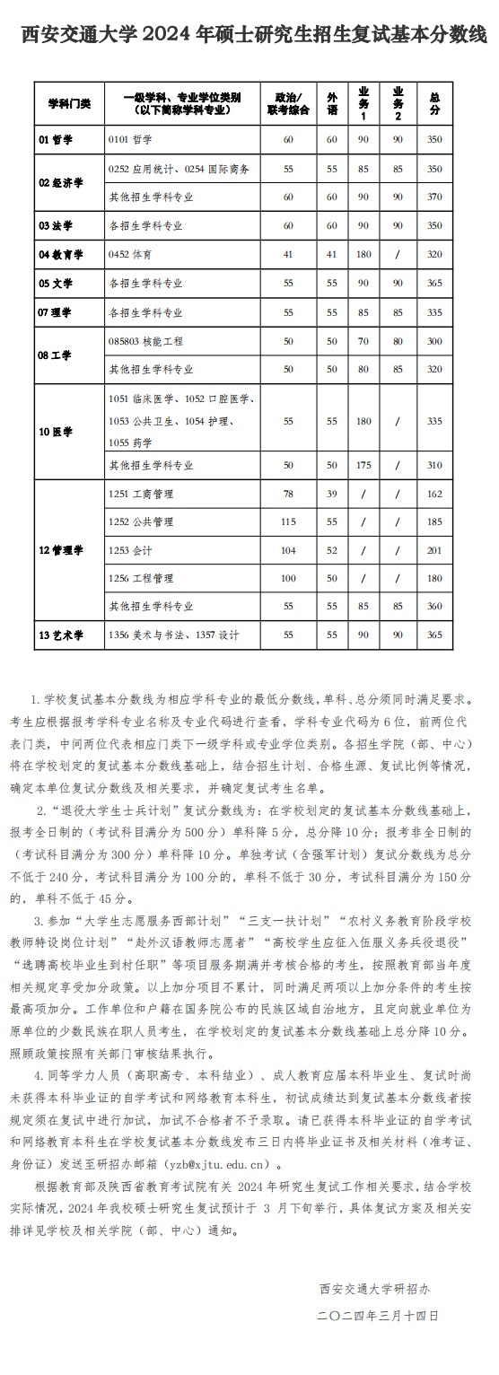 西安交通大學2024年碩士研究生招生復試基本分數線