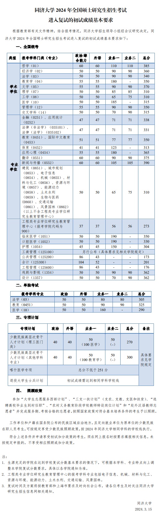 同濟大學2024年全國碩士研究生招生考試進入復試的初試成績基本要求