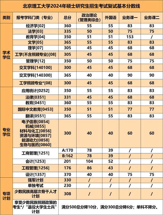 | 北京理工大學2024年碩士研究生招生考試 復試基本分數線 |