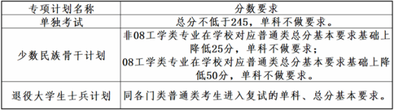 2.退役大學(xué)生士兵專項計劃考生進入專業(yè)復(fù)試的初試成績要求(專業(yè)分數(shù)線)同對應(yīng)專業(yè)(研究方向)普通類考生一致。