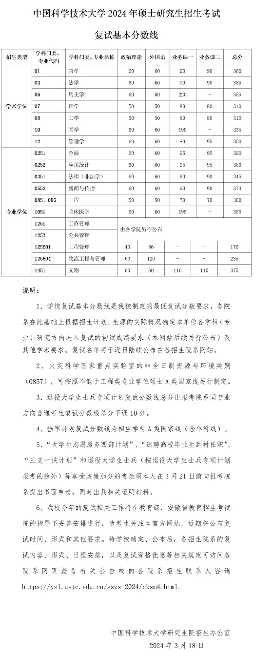中國科學技術大學2024年碩士研究生招生考試復試基本分數線