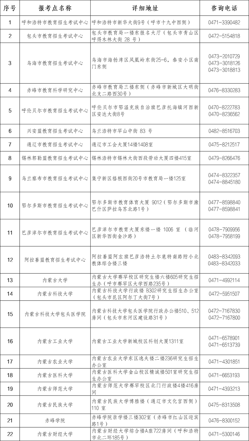 | 2026年全國碩士研究生招生考試內蒙古自治區報考點名稱、地址、咨詢電話 |