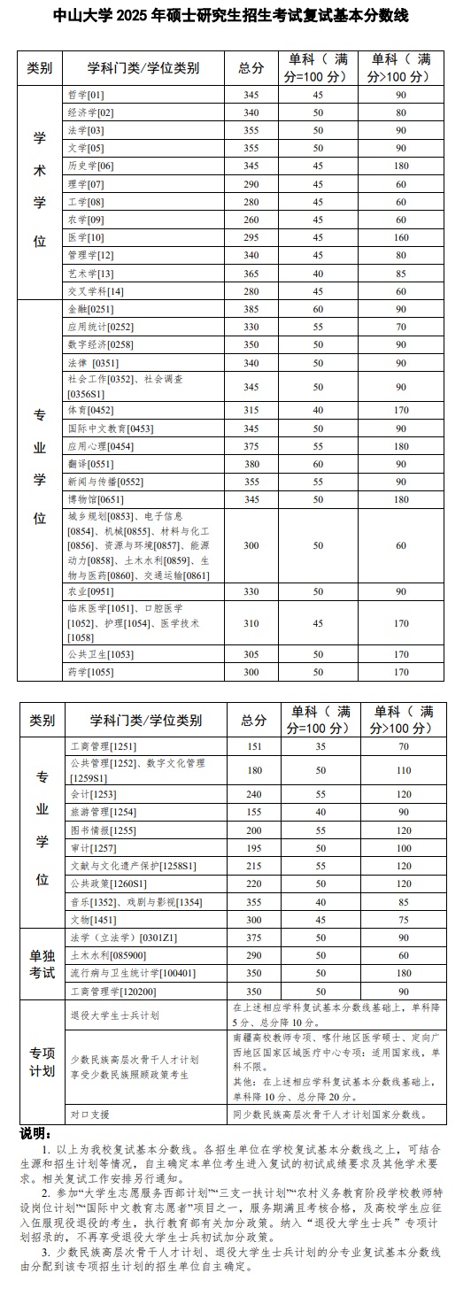 中山大學2025年碩士研究生招生考試復試基本分數線