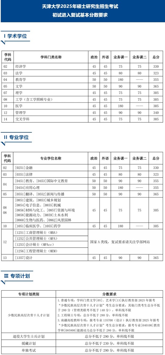 | 天津大學2025年碩士研究生招生考試 初試進入復試基本分數要求 |
