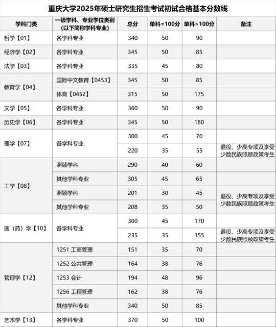 | 重慶大學(xué)2025年碩士研究生招生考試初試合格基本分?jǐn)?shù)線 |