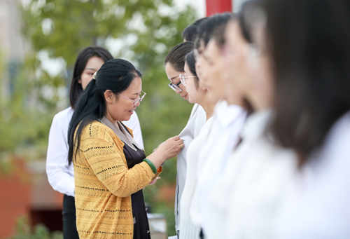 隨后,校黨委副書記、執(zhí)行校長徐愛民,組織部部長黃巖及青島第五屆高校教學(xué)名師獲得者莊新穎、單菁華為新進(jìn)教師佩戴校徽。