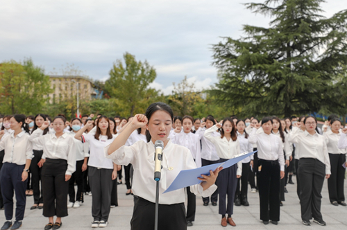 學(xué)校優(yōu)秀教師代表,馬克思主義學(xué)院教師劉鎖霞領(lǐng)誓。全體新入職教師舉起右手面對國旗和校旗莊嚴(yán)宣誓,志愿做一名光榮的人民教師,對黨和人民的教育事業(yè)進(jìn)行了莊嚴(yán)承諾。