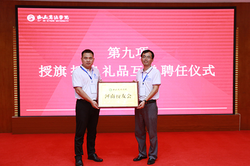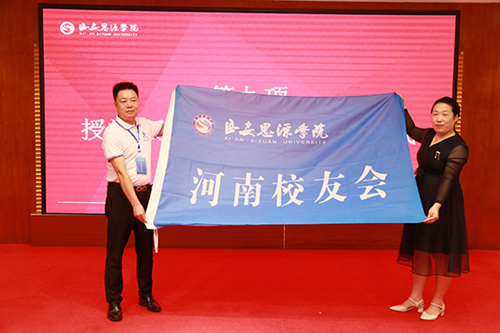 隨后,在全場熱烈的掌聲中,西安思源學院校友總會秘書長、校友辦主任陳海琴,校友總會副秘書長、校友辦副主任劉景常分別為河南校友會授會旗、授會牌,并向河南校友會第一屆理事會班子成員頒發了聘書,互贈了紀念品。
