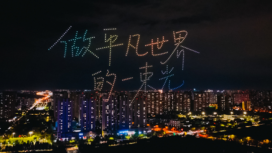當晚最為震撼和驚喜的環節,當屬666架無人機騰空而起,以光為畫筆,拼出“歐亞30歲生日快樂”“和而不同”“做平凡世界的一束光”等字樣,以及歐亞1995-2025的時光軌跡、校園標志建筑和巨型的生日蛋糕,照亮雨后初晴的夜空,點亮歐亞光之盛典最動人的篇章。據了解,這些無人機表演是由1998級校友、河南校友會會長葉百海與校友楊鵬程特別贊助。
