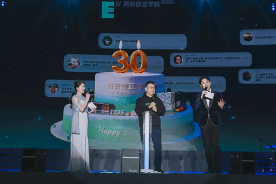 “祝你生日快樂,祝你生日快樂……”當天幕中的巨型生日蛋糕緩緩盤旋時,西安歐亞學院創辦人、董事長胡建波也為舞臺中央大屏幕里的“賽博蛋糕”點亮“電子蠟燭”,臺下觀眾齊聲合唱生日快樂歌,共同見證歐亞翻開“而立”之頁。