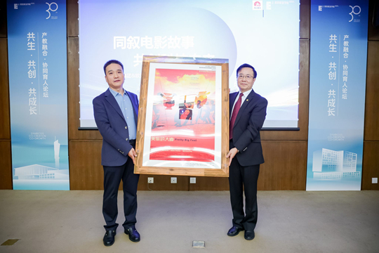 閆禹以《西部電影集團&西安歐亞學院產教融合、深度合作》為題,以戰略級夢想合伙人、共創者、踐行者、同行者的角色,展現了雙方在共建文旅生態方面的相關合作。通過提供豐富的實習就業崗位、多樣的交流展示平臺,校企雙方打造了產學研一體化模式,實現了人才合作在多領域的協同發展。報告尾聲,西部電影集團為歐亞建校30周年獻上了賀禮,趙國華代表學校接受賀禮。