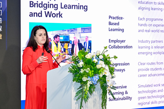 英國伯明翰大學學院副校長,工程、數字化與可持續建筑領域執行院長Rosa Wells教授以《通過實踐導向學習 賦能產業發展》為主題,系統地分享了歐洲產教融合的前沿經驗。她介紹,歐洲高校聚焦于“真實場景 + 虛擬實訓”的融合模式,主張高校與企業共同建設安全實訓空間,借助技術手段降低高危操作風險,提高人才培養成效。