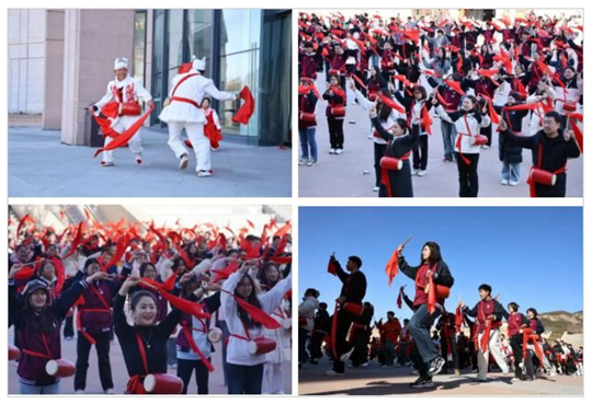 場景互動體驗課中激情教學(xué)陜北腰鼓,紅色的腰鼓系在腰間,鮮艷的綢帶隨風(fēng)飄揚。學(xué)員們認真學(xué)習(xí)基本動作和技巧,敲打出激昂有力的鼓點。歡快的鼓聲中洋溢出燦爛的笑容,紅色文化在互動傳習(xí)中代代相傳。