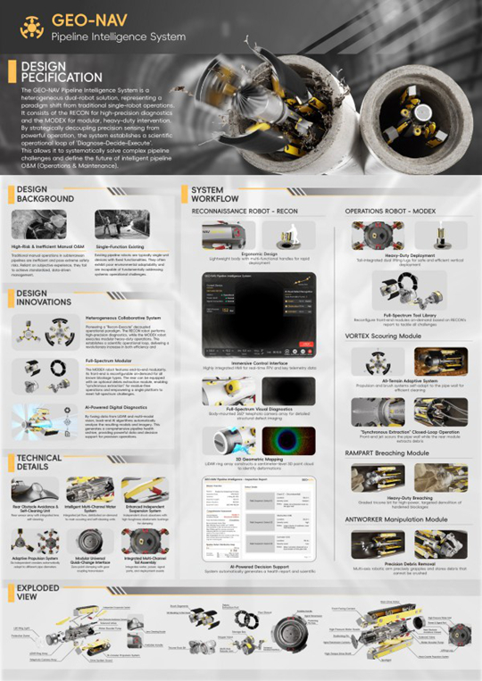 此次獲獎作品由工業設計教研室馮穎老師指導,學生林榮鑫創作,《“經緯”管道智能運維雙體系統》(GEO-NAV Pipeline Intelligence System)是一項針對城市地下基礎設施維護難題的創新解決方案。針對傳統管道運維中存在的“人工高風險、單一機器人功能受限”等痛點,林榮鑫提出了一種“異構雙體協同”的作業模式——系統由負責高精度勘察診斷的“經”(RECON)機器人與負責重型修復作業的“緯”(MODEX)機器人組成。