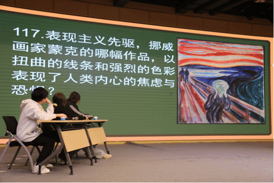 在賽程設計上,賽事分為報名、初賽、決賽三個階段,形成了 “廣泛參與 — 擇優晉級 — 巔峰對決” 的科學選拔機制。報名階段通過各院系廣泛動員,最終吸引全校 551 名學子踴躍報名,參賽學生覆蓋各個年級、各個專業,真正實現了美育的全員覆蓋;初賽階段采用線下筆試形式,以客觀題考察學生藝術通識基礎,最終按成績前 20%選拔出 106 名選手晉級決賽;決賽階段在恒友樓 4 樓報告廳舉行,設置個人循環答題賽、個人搶答賽兩個環節,從知識儲備、反應速度、能力展現、理解表達等多個維度全方位考察選手的綜合藝術素養。現場選手們反應迅速、爭先搶答的同時沉著應答,既展現了扎實的知識儲備與靈活的應變能力,也讓在場觀賽師生在沉浸式氛圍中同步學習了大量藝術通識知識,實現了 “以賽促學、觀賽受益” 的雙重效果。